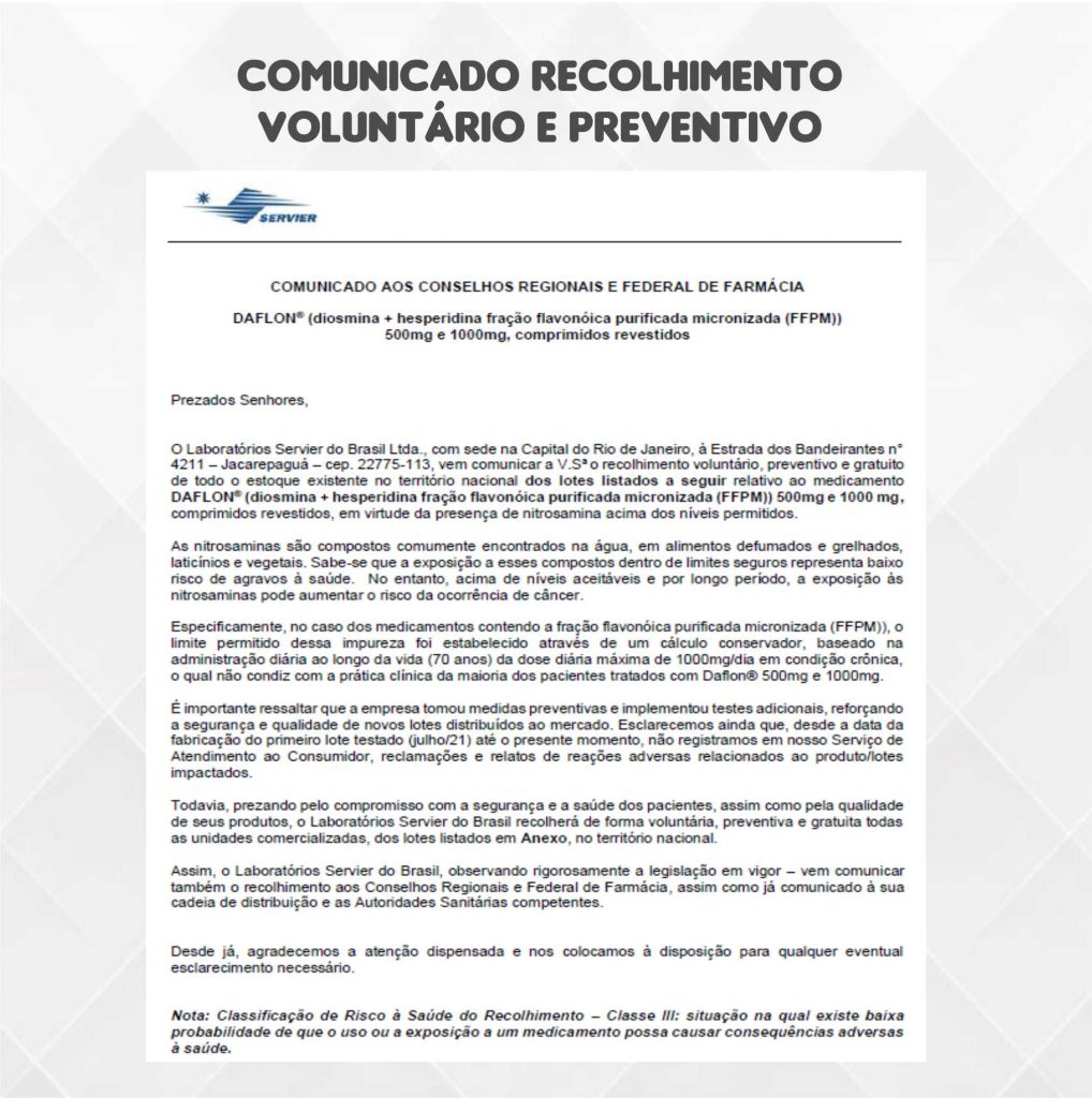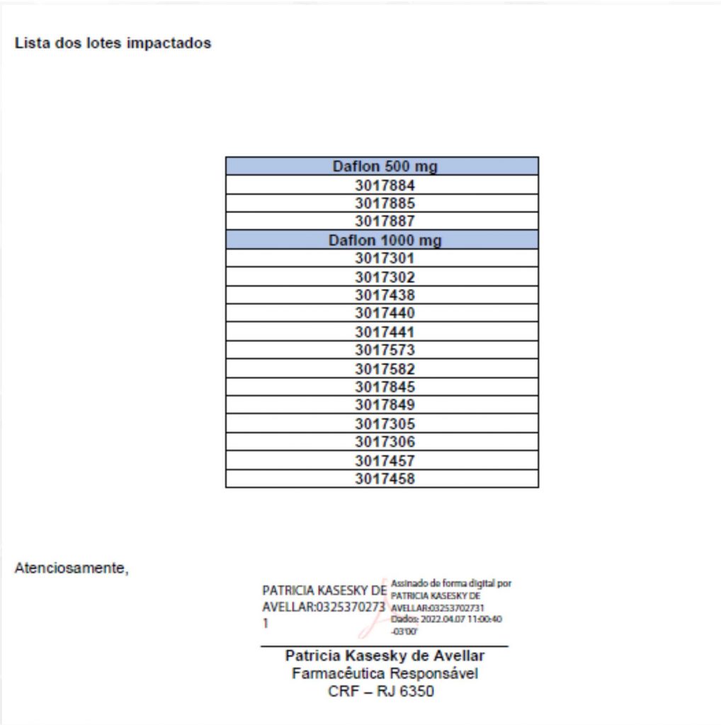 O Laboratórios Servier do Brasil Ltda, informa ao seu mercado consumidor que está realizando o recolhimento dos lotes listados: