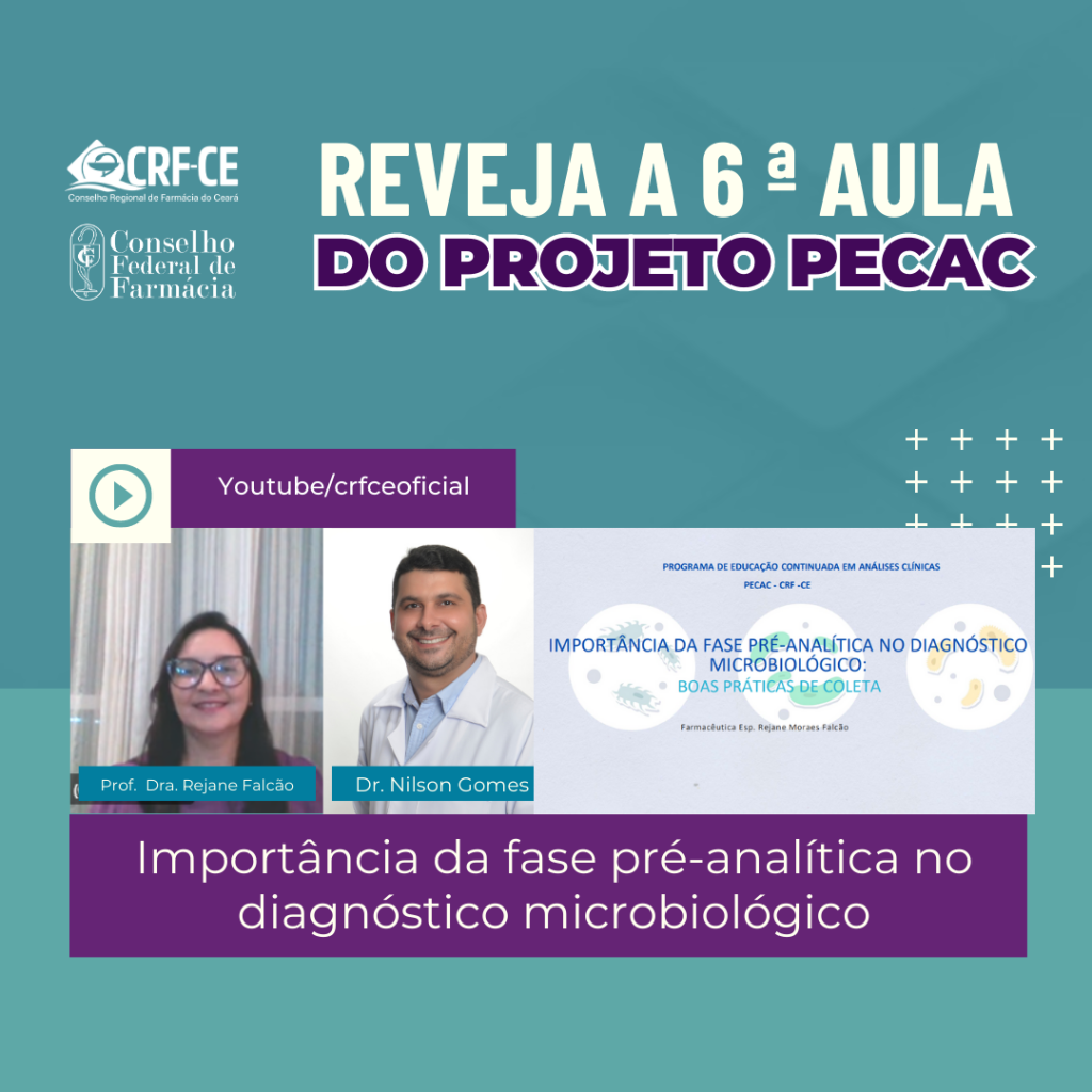 O CRF-CE e CFF em parceria com a sua Comissão Técnica Assessora de Análises Clínicas e Toxicológicas e apoio do Conselho Federal de Farmácia, através do Dr. Egberto Feitosa e Dr. Nilson Gomes promoveram ontem, 21 de agosto a 6ª Aula do Projeto Programa de Educação Continuada em Análises Clínicas (PECAC) , através do canal do Youtube do CRF-CE, com o tema “Importância da fase pré-analítica no diagnóstico microbiológico”, ministrado pela Dra. Rejane Moraes Falcão.