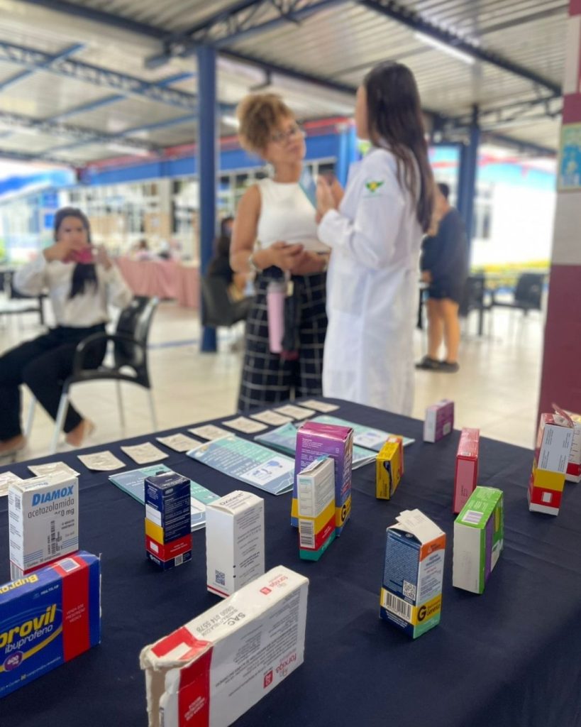 A atividade abordou temas como automedicação, armazenamento adequado, importância da prescrição profissional e riscos do uso indiscriminado de fármacos, por meio da distribuição de materiais informativos e orientações com linguagem acessível e embasamento técnico.
