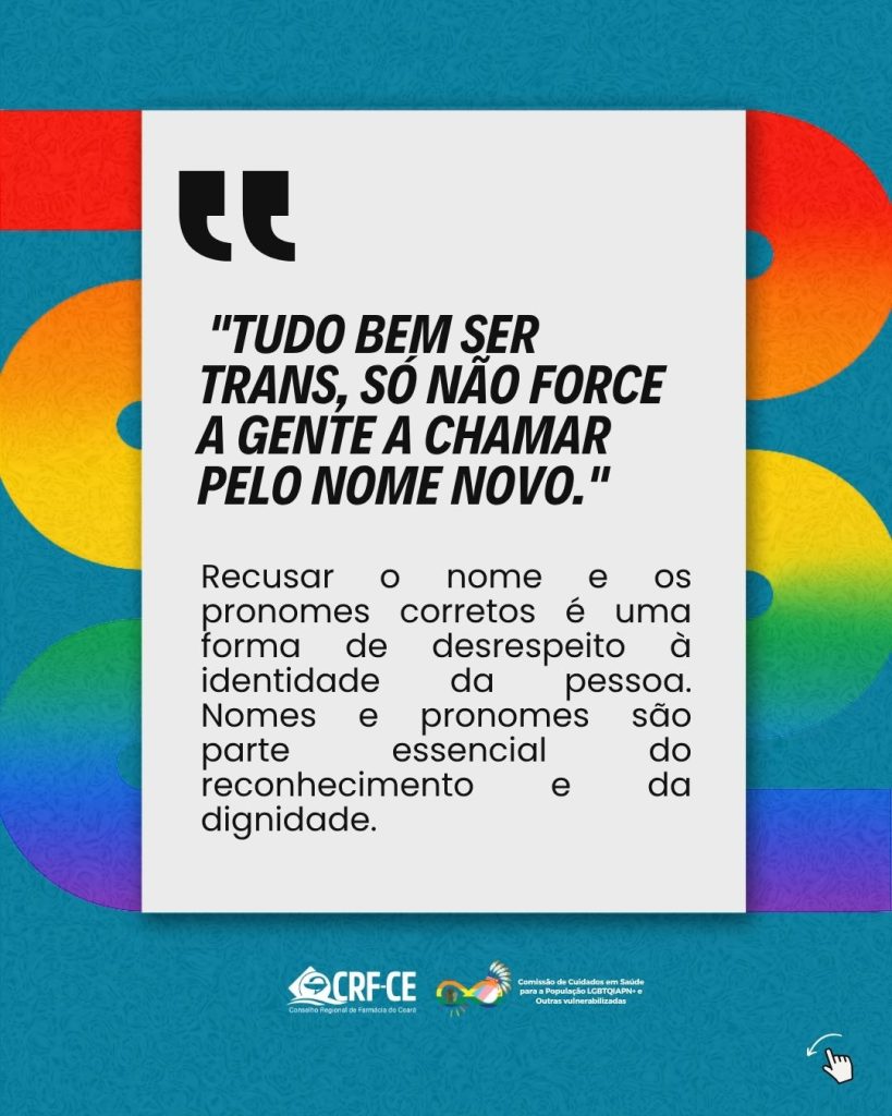 O CRF-CE reforça seu compromisso com a inclusão, o respeito e a valorização da diversidade, e reafirma seu compromisso com a equidade em todos os espaços, inclusive na saúde.