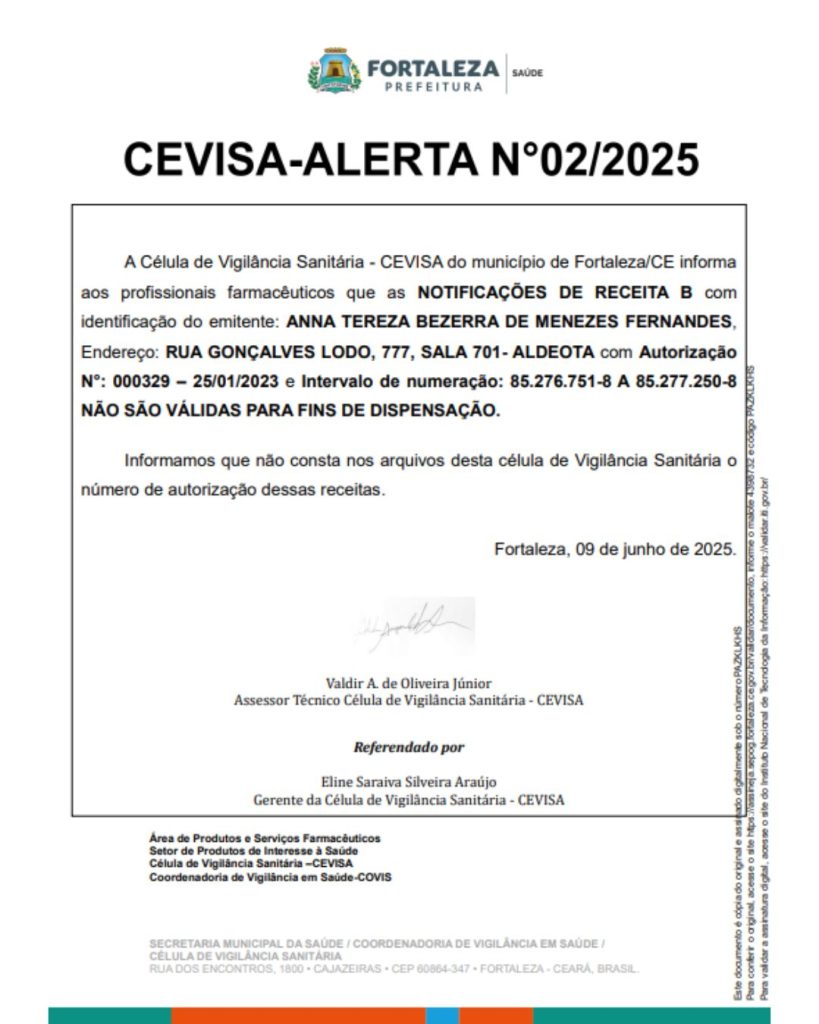 A Célula de Vigilância Sanitária – CEVISA do município de Fortaleza/CE informa aos profissionais farmacêuticos que as NOTIFICAÇÕES DE RECEITA B com identificação do emitente: ANNA TEREZA BEZERRA DE MENEZES FERNANDES, Endereço: RUA GONÇALVES LODO, 777, SALA 701- ALDEOTA com Autorização N°: 000329 – 25/01/2023 e Intervalo de numeração: 85.276.751-8 A 85.277.250-8 NÃO SÃO VÁLIDAS PARA FINS DE DISPENSAÇÃO.