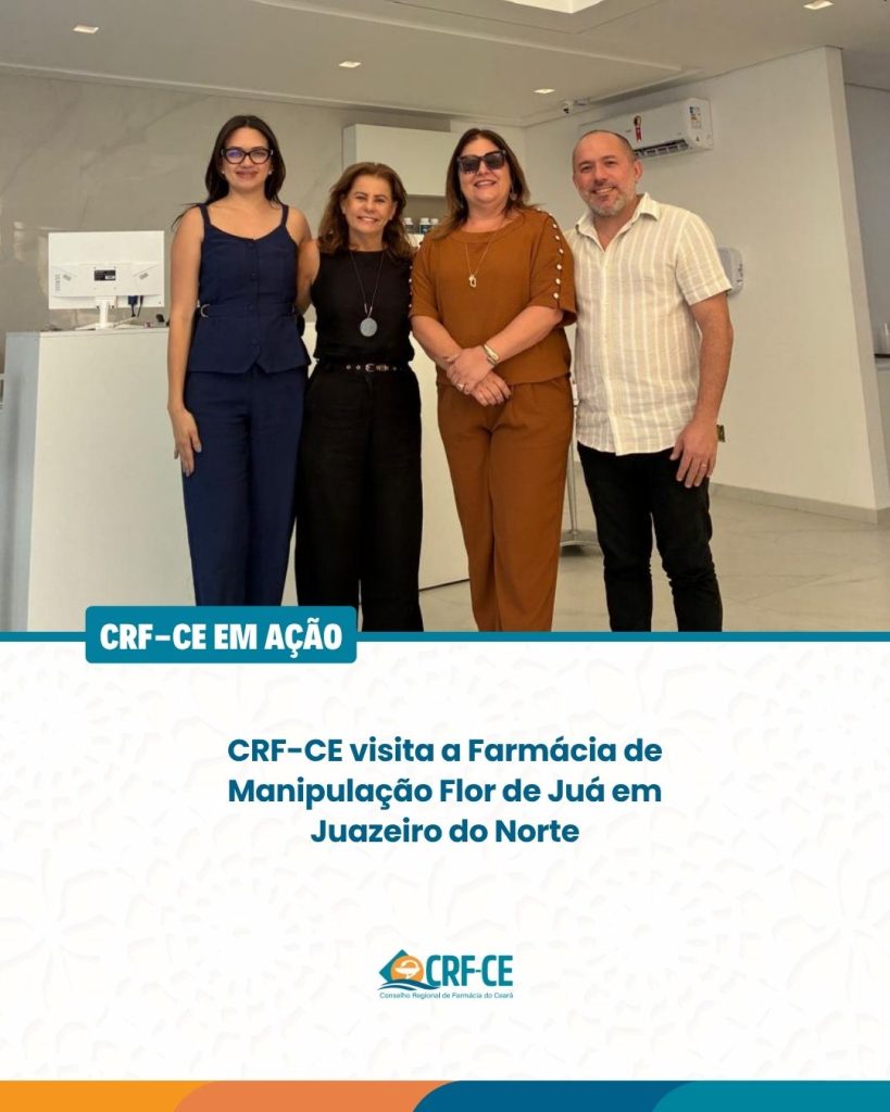 O Conselho Regional de Farmácia do Ceará (CRF-CE), representado pela Dra. Arlandia Nobre, presidente do CRF-CE e pelo Dr. Micael Nobre, membro da Comissão Técnica Assessora de Assistência Farmacêutica, realizou uma visita institucional à Farmácia de Manipulação Flor de Juá, reforçando o compromisso com o acompanhamento técnico e a valorização das boas práticas farmacêuticas no estado.