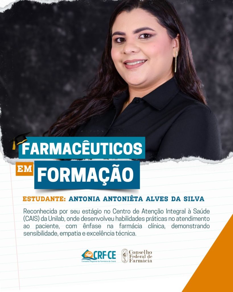 O Conselho Regional de Farmácia do Ceará (CRF-CE), junto aos seus Conselheiros Federais e Regionais, parabenizam a acadêmica de Farmácia Antonia Antoniêta Alves da Silva por sua trajetória exemplar e dedicação. Atuou como estagiária no Centro de Atenção Integral à Saúde (CAIS) da Universidade da Integração Internacional da Lusofonia Afro-Brasileira (Unilab), sob a supervisão do Prof. Dr. Jeferson Falcão do Amaral, onde desenvolveu habilidades práticas no atendimento ao paciente, com ênfase na farmácia clínica. Seu compromisso com o cuidado integral e humanizado se destacou desde então, demonstrando sensibilidade, empatia e excelência técnica.