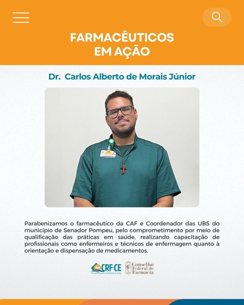 A Diretoria do Conselho Regional de Farmácia do Ceará (CRF-CE), Conselheiros Federais e Regionais, parabenizam o Dr. Carlos Alberto de Morais Júnior, farmacêutico da CAF e Coordenador das UBS do município de Senador Pompeu, pelo comprometimento por meio de qualificação das práticas em saúde, realizando capacitação de profissionais como enfermeiros e técnicos de enfermagem quanto à orientação e dispensação de medicamentos.