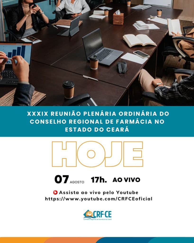 Hoje, dia 07 de agosto de 2025, a partir das 17h, o Conselho Regional de Farmácia do Estado do Ceará (CRF-CE) realiza sua XXXIX Reunião Plenária Ordinária — e você pode assistir ao vivo pelo canal oficial no YouTube!