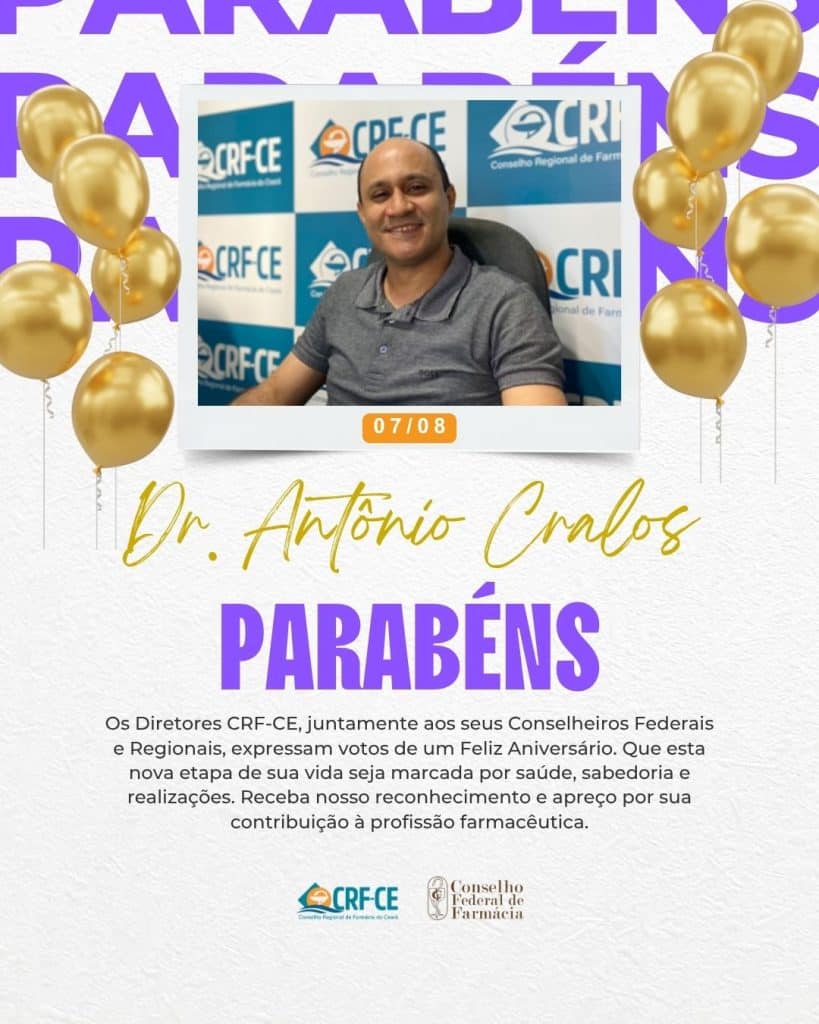 Os Diretores CRF-CE, juntamente aos seus Conselheiros Federais e Regionais, expressam votos de um Feliz Aniversário. Que esta nova etapa de sua vida seja marcada por saúde, sabedoria e realizações. Receba nosso reconhecimento e apreço por sua contribuição à profissão farmacêutica.
