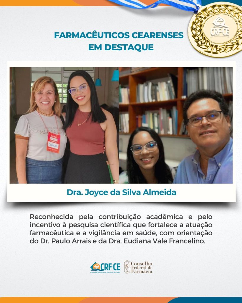 A Diretoria do Conselho Regional de Farmácia do Ceará (CRF-CE), Conselheiros Federais e Regionais, parabenizam a Dra. Joyce da Silva Almeida, Dra. Eudiana Vale Francelino (@eudianavale) e Dr. Paulo Arrais (@parrais.farmaceutico), pela contribuição acadêmica e pelo incentivo à pesquisa científica que fortalece a atuação farmacêutica e a vigilância em saúde.
