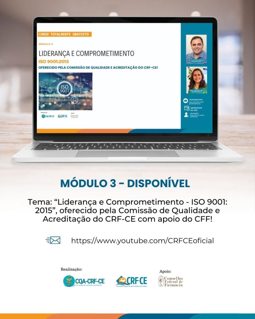 A Comissão de Qualidade e Acreditação do Conselho Regional de Farmácia do Ceará (CRF-CE), com apoio do Conselho Federal de Farmácia (CFF) tem o prazer de apresentar o módulo 3: “Liderança e Comprometimento – ISO 9001:2015” Uma oportunidade única de dominar os requisitos desta importante certificação e impulsionar a excelência em sua organização sem nenhum custo!