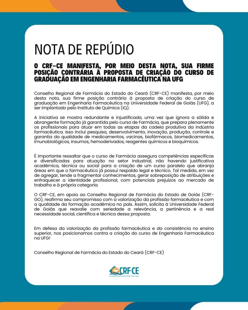 O Conselho Regional de Farmácia do Estado do Ceará (CRF-CE) manifesta, por meio desta nota, sua firme posição contrária à proposta de criação do curso de graduação em Engenharia Farmacêutica na Universidade Federal de Goiás (UFG), a ser implantado pelo Instituto de Química (IQ).