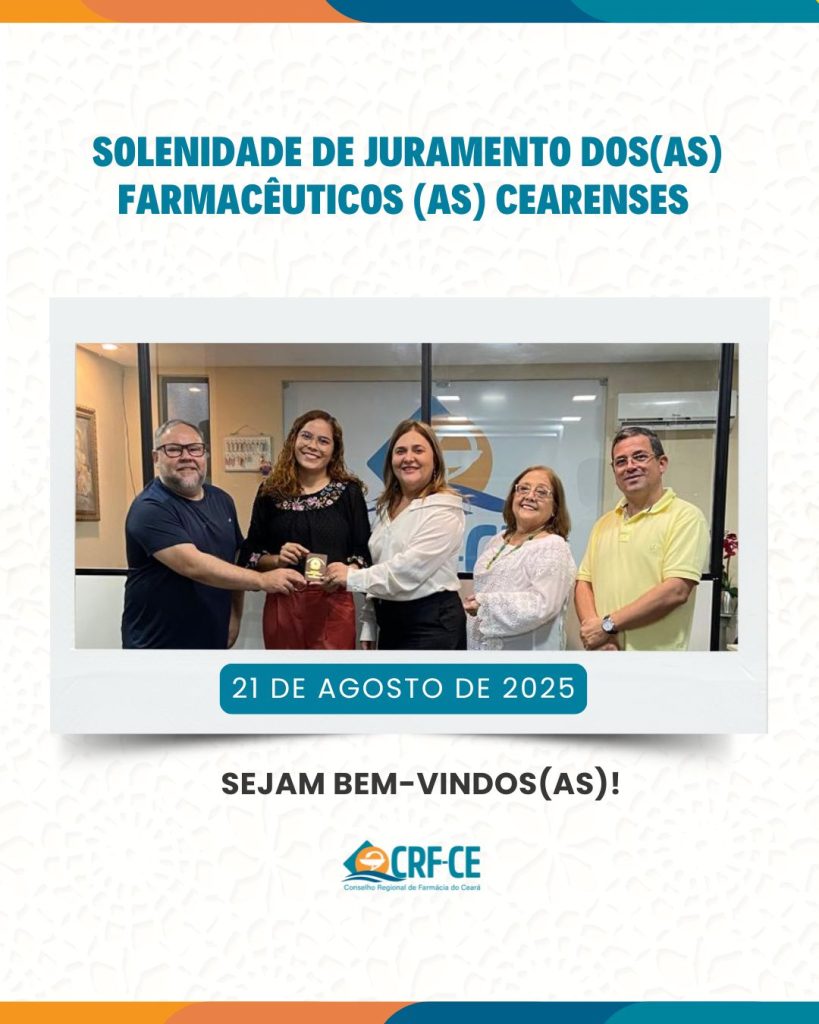 Desejamos boas-vindas a farmacêutica Dra. Isabelle De Fátima Vieira Camelo Maia que, no dia 21 de agosto, assumiu publicamente seu compromisso com a saúde e o bem-estar da população cearense. A cerimônia foi conduzida pela Dra. Arlandia Nobre, Presidente do CRF-CE e Dr. Flávio Maia, Vice-Presidente; Dr. Marcelo Linhares, Secretário-Geral e Dra. Vânia Cordeiro, Tesoureira do CRF-CE.