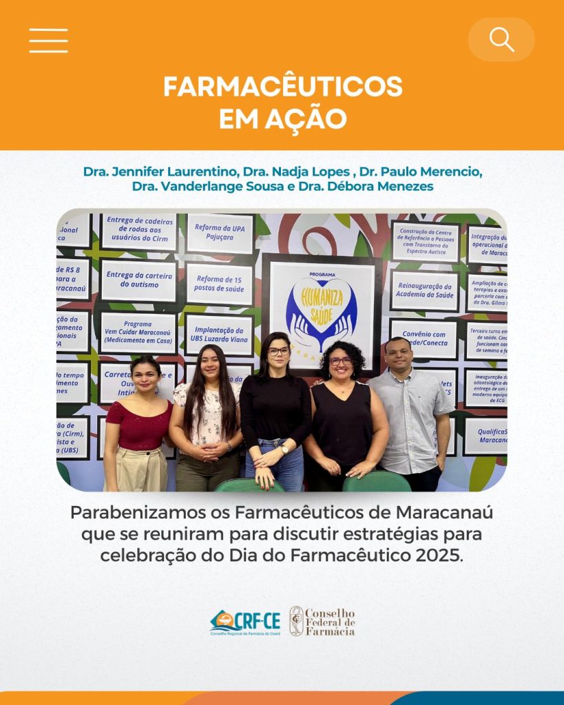 A Diretoria do Conselho Regional de Farmácia do Ceará (CRF-CE), Conselheiros Federais e Regionais, parabenizam os farmacêuticos da direção da Comissão de Farmácia e Terapêutica de Maracanaú, Dra. Nadja Lopes e Dra. Jennifer Laurentino, juntamente com o diretor de Assistência Farmacêutica do município, Dr. Paulo Merencio, a secretária de Saúde, Dra. Vanderlange Sousa e a Presidente do Conselho de Saúde, Débora Menezes.