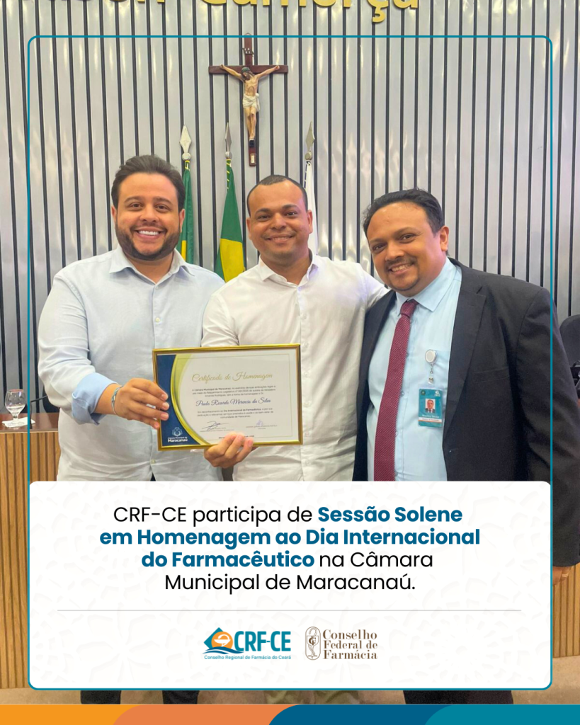 O CRF-CE parabeniza os(as) farmacêuticos(as) do município pela merecida homenagem, reafirmando a importância do seu papel essencial para a saúde, o cuidado e o bem-estar da população.