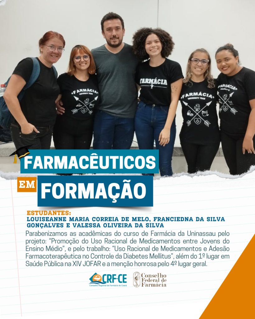 O Conselho Regional de Farmácia do Ceará (CRF-CE), junto aos seus Conselheiros Federais e Regionais, parabeniza as acadêmicas Louiseanne Maria Correia de Melo, Franciedna da Silva Gonçalves e Valessa Oliveira da Silva, alunas do 8º semestre de Farmácia do Centro Universitário Maurício de Nassau (UNINASSAU), unidade Parangaba, por desenvolverem dois trabalhos significativamente relevantes em Fortaleza – CE, no contexto da disciplina: Atividade Prática Interdisciplinar de Extensão (APIEX), cuja responsável é a Profa. Mayara Amélia de Aguiar Maia Saldanha.