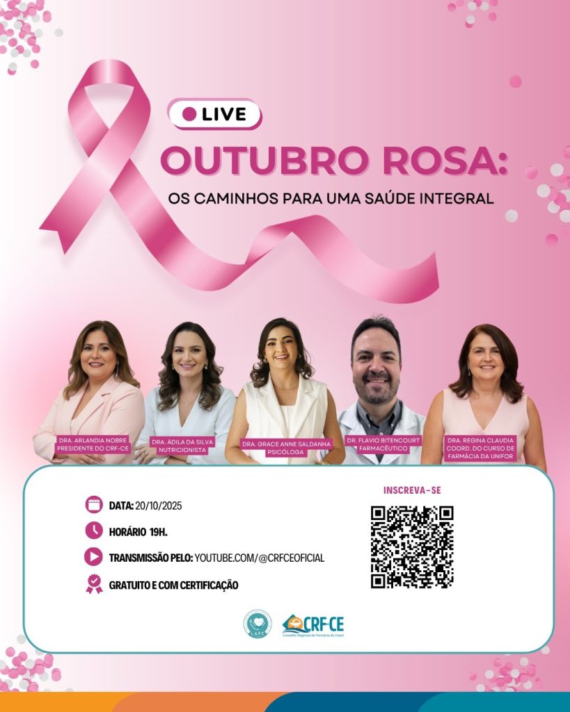 O evento reunirá especialistas das áreas de Nutrição, Psicologia e Farmácia, que trarão diferentes perspectivas sobre prevenção, autocuidado e qualidade de vida no contexto do Outubro Rosa.