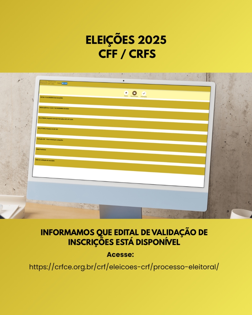 O Conselho Regional de Farmácia do Ceará informa que o Edital de Validação de Inscrições para as Eleições 2025 do Conselho Federal e dos Conselhos Regionais de Farmácia já está disponível.