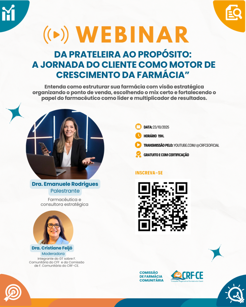 O Webinar será mediado pela Dra. Cristiane Feijó, integrante da Integrante do GT sobre F. Comunitária do CFF e da Comissão de F. Comunitária do CRF-CE.