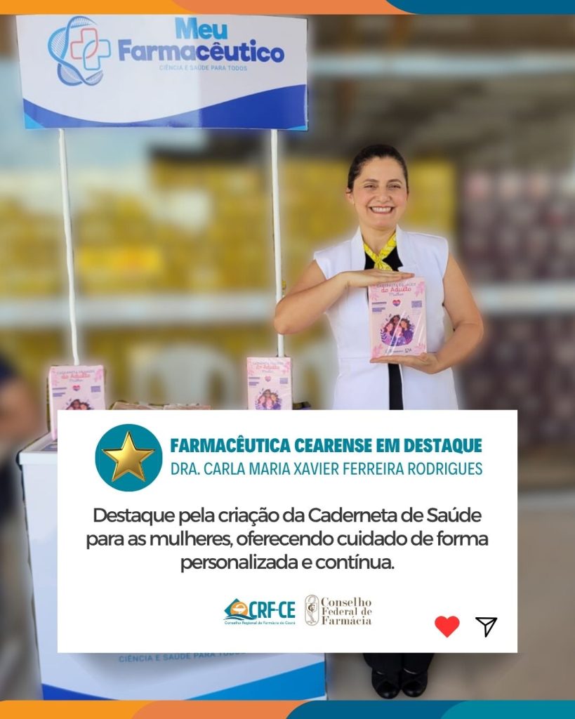 O Conselho Regional de Farmácia do Ceará (CRF-CE), por meio de sua Diretoria, Conselheiros Federais e Regionais, parabeniza a farmacêutica Dra. Carla Maria Xavier Ferreira Rodrigues pela criação da Caderneta de Saúde para Mulheres.