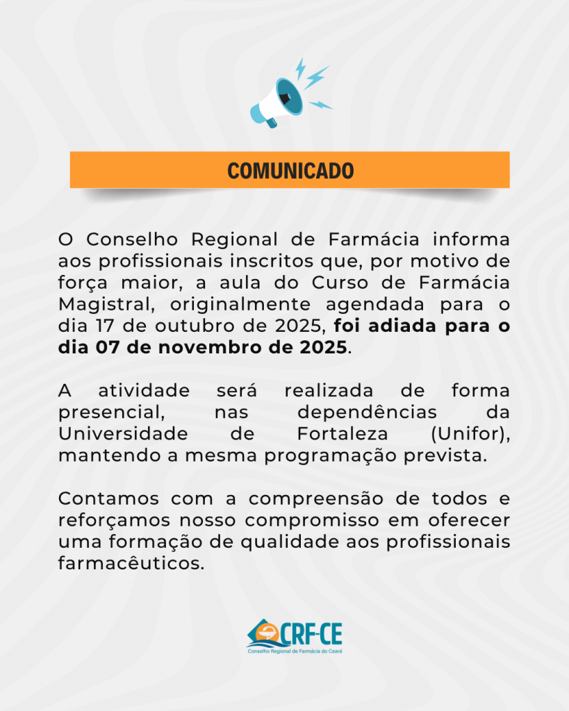 O Conselho Regional de Farmácia informa aos profissionais inscritos que, por motivo de força maior, a aula do Curso de Farmácia Magistral, originalmente agendada para o dia 17 de outubro de 2025, foi adiada para o dia 07 de novembro de 2025.