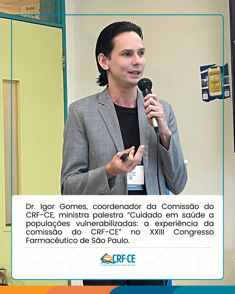 O coordenador da Comissão de Saúde e Cuidado Farmacêutico Para a População Lgbtqiapn+, Povos Originários, Negros e Outras Populações Vulnerabilizadas do CRF-CE, Dr. Igor Gomes de Araújo, participou como palestrante, no domingo, dia 12 de outubro, do XXIII Congresso Farmacêutico de São Paulo.
