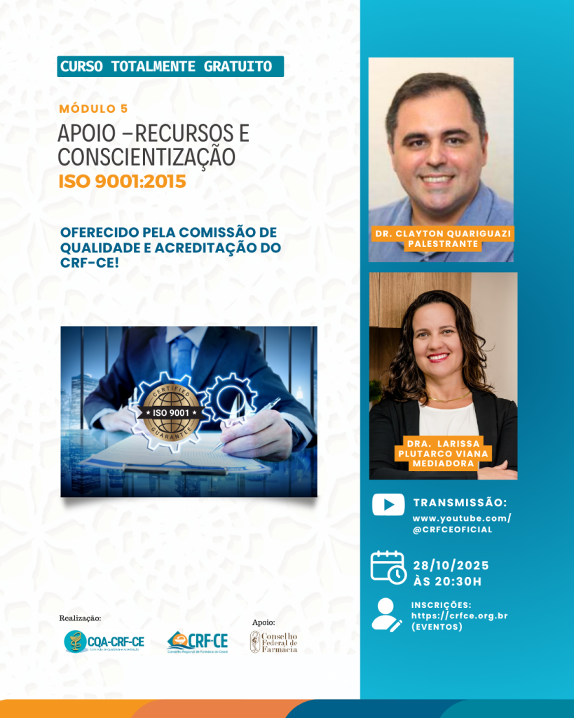 A Comissão de Qualidade e Acreditação do CRF-CE, com apoio do CFF, convida você para o módulo 5 “Apoio – Recursos e Conscientização- ISO 9001:2015”