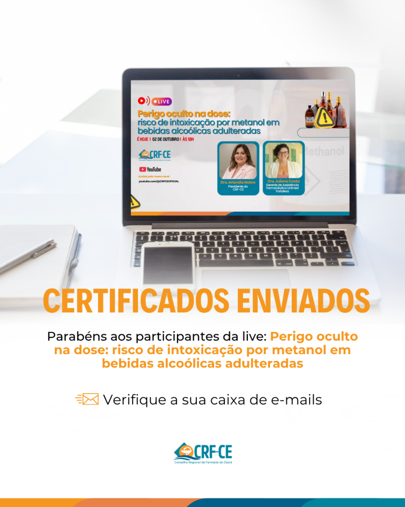 A Diretoria do Conselho Regional de Farmácia do Ceará (CRF-CE), parabeniza todos os participantes da live: “Perigo oculto na dose: risco de intoxicação por metanol em bebidas alcoólicas adulteradas”, realizada no dia 02 de outubro de 2025.