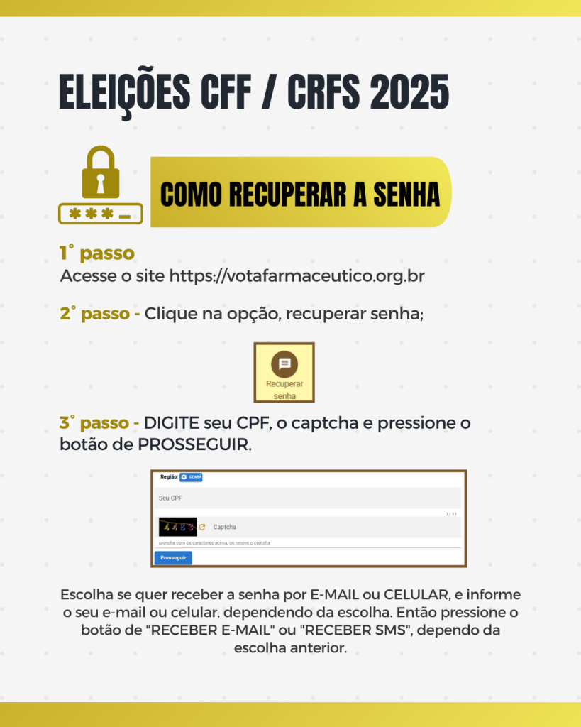 Escolha se quer receber a senha por E-MAIL ou CELULAR, e informe o seu e-mail ou celular, dependendo da escolha. Então pressione o botão de “RECEBER E-MAIL” ou “RECEBER SMS”, dependo da escolha anterior;