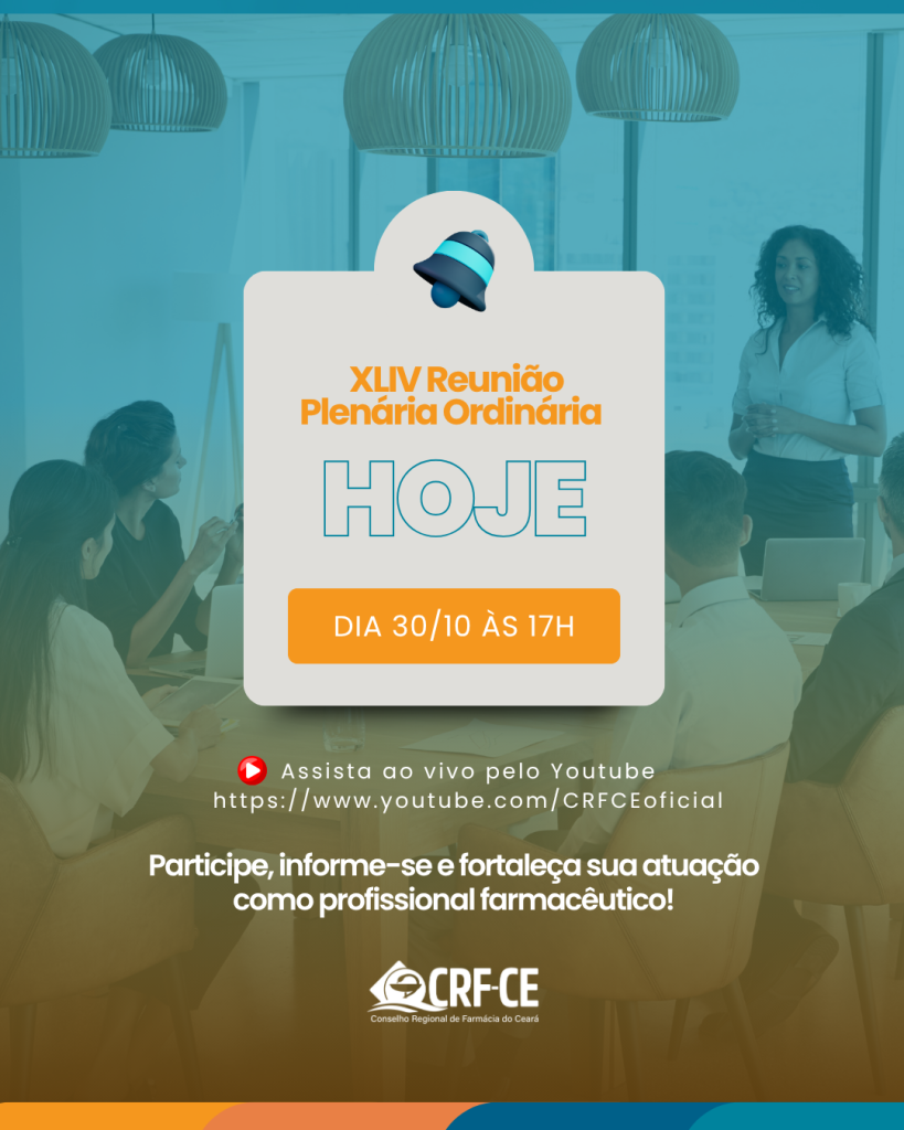 Nesta quinta-feira, 30 de outubro, a partir das 17 horas, será realizada pelo Conselho Regional de Farmácia do Ceará (CRF-CE) a XLIV Reunião Plenária Ordinária, e convidamos você para assistir ao vivo pelo nosso canal oficial do Youtube.