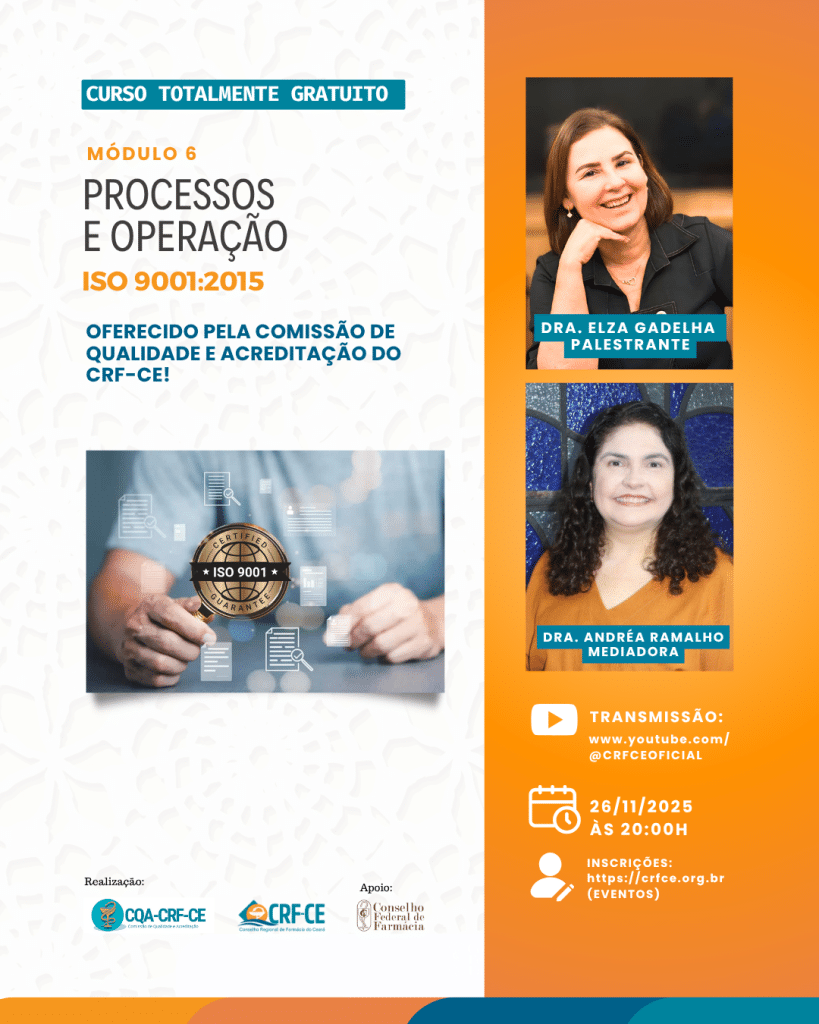 A Comissão de Qualidade e Acreditação do Conselho Regional de Farmácia do Estado do Ceará (CRF-CE), com o apoio do Conselho Federal de Farmácia (CFF), convida os profissionais e estudantes de Farmácia a participarem do Módulo 6 do Curso Gratuito sobre ISO 9001:2015, com o tema “Processos e Operação”.