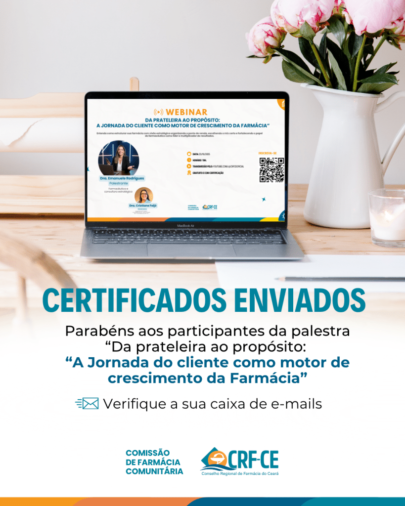A Diretoria do Conselho Regional de Farmácia do Ceará (CRF-CE), juntamente com os Conselheiros Regionais e Federais, parabeniza todos os participantes da palestra: “Da prateleira ao propósito: “A Jornada do cliente como motor de crescimento da Farmácia”.