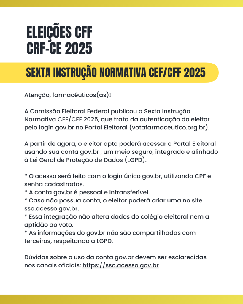A Comissão Eleitoral Federal publicou a Sexta Instrução Normativa CEF/CFF 2025, que trata da autenticação do eleitor pelo login gov.br no Portal Eleitoral (votafarmaceutico.org.br).