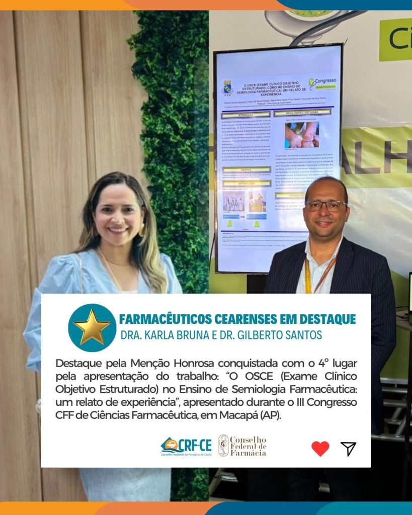O Conselho Regional de Farmácia do Ceará (CRF-CE), por meio de sua Diretoria, Conselheiros Federais e Regionais, parabeniza os farmacêuticos Dra. Karla Bruna e Dr. Gilberto Santos pela Menção Honrosa conquistada com o 4º lugar na modalidade banner durante o III Congresso CFF de Ciências Farmacêuticas, realizado em Macapá (AP), no mês de outubro.