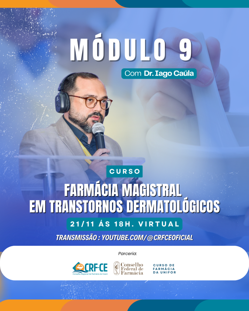 O Conselho Regional de Farmácia do Ceará (CRF-CE), o Conselho Federal de Farmácia (CFF) e o Curso de Farmácia da Universidade de Fortaleza (UNIFOR) convidam você para participar da Aula 9 do Curso de Farmácia Magistral, que terá como Tema: Farmácia Magistral em transtornos dermatológicos, ministrada pelo Dr. Iago Caúla (@iagocaula).