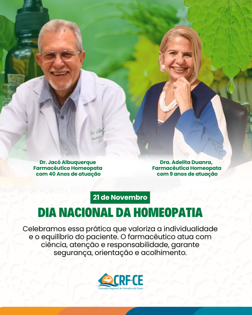 Uma homenagem do CRFCE a todos os profissionais da área, em especial ao Dr. Jacó Albuquerque (@jacoalbuquerquelopes), Ex-presidente do CRF-CE, integrante da nossa Comissão de Práticas Integrativas e Complementares em Saúde, Farmacêutico Homeopata, com 40 anos de atuação dedicados a essa importante área. E a Dra. Adelita Duanra (@dra.adelitaduanra), Farmacêutica, é uma profissional com sólida formação acadêmica e especialização em Práticas Integrativas e Complementares (PICs), com 9 anos de atuação.