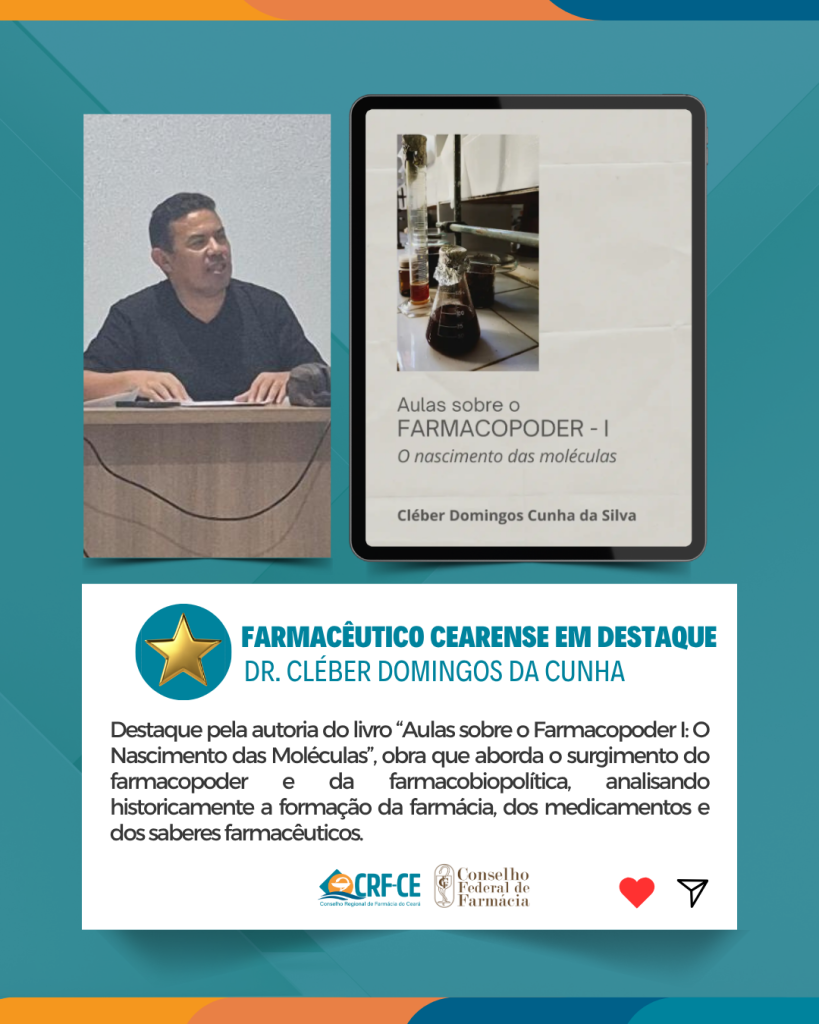 O Conselho Regional de Farmácia do Ceará (CRF-CE), por meio de sua Diretoria, Conselheiros Federais e Regionais, parabeniza o farmacêutico Dr. Cléber Domingos da Cunha pela autoria do livro “Aulas sobre o Farmacopoder I: O Nascimento das Moléculas”.