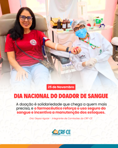 Na imagem, a farmacêutica Dra. Geysa Aguiar (@geysaaguiar7), integrante das Comissões Técnicas do CRF-CE, realiza um gesto de solidariedade ao doar sangue, reforçando a importância desse ato voluntário para salvar vidas e incentivar a participação da sociedade em campanhas de doação