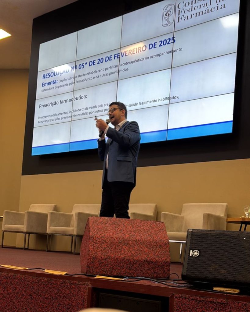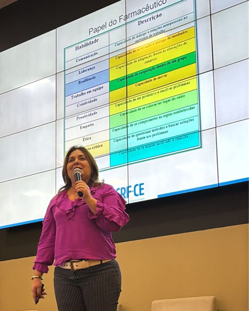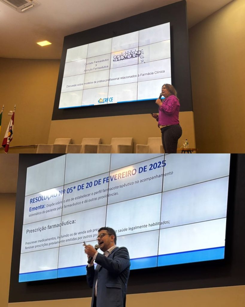 A palestra foi proferida pela Presidente do CRF-CE, Dra. Arlandia Nobre, e pelo Conselheiro Federal Suplente pelo Ceará, Dr. Nilson Gomes, no dia 24 de novembro de 2025, às 19h, no Auditório Central Oscar Spíndola Rodrigues, reunindo acadêmicos, professores e profissionais para um importante momento de reflexão e debate.