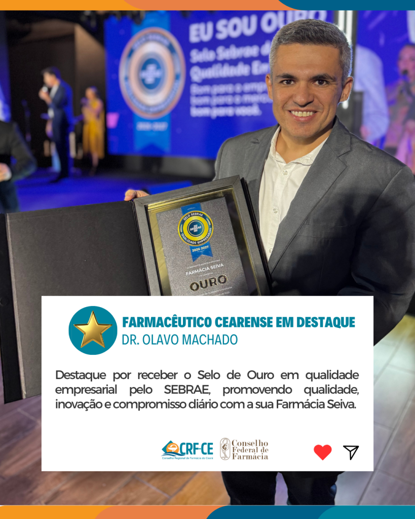 O Conselho Regional de Farmácia do Ceará (CRF-CE), por meio de sua Diretoria, Conselheiros Federais e Regionais, parabeniza o farmacêutico Dr. Olavo Machado por receber o Selo de Ouro em qualidade empresarial pelo SEBRAE.