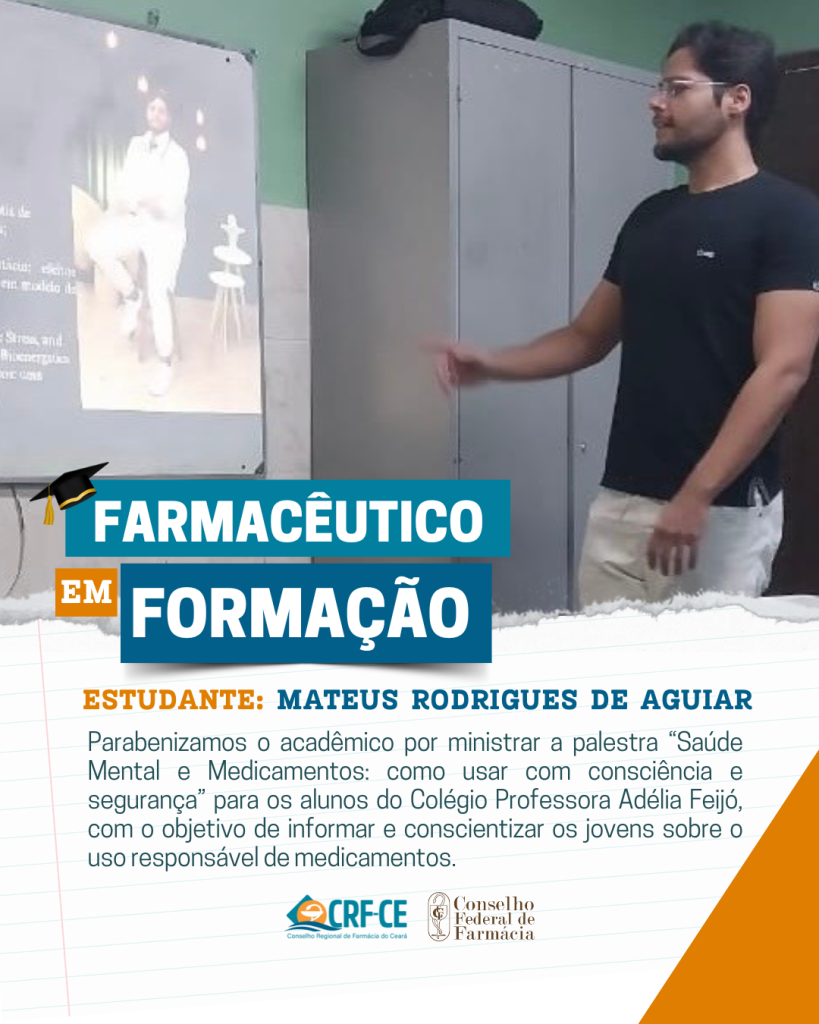 A Diretoria do Conselho Regional de Farmácia do Ceará (CRF-CE), Conselheiros Federais e Regionais, parabenizam o acadêmico Mateus Rodrigues de Aguiar, pela palestra apresentada, chamada de “Saúde mental e Medicamentos: como usar com consciência e segurança”.