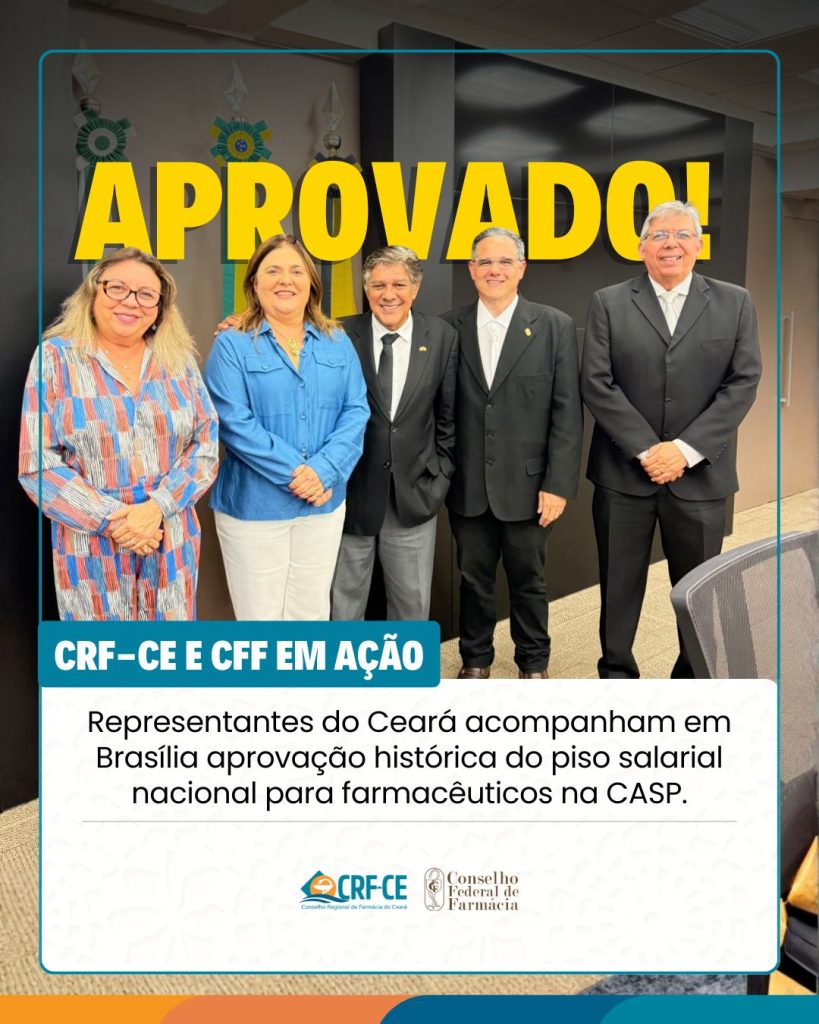 Em Brasília, nesta terça-feira (25), vive-se um momento histórico para a farmácia brasileira. Representando o Ceará, a Dra. Arlandia Nobre, presidente do Conselho Regional de Farmácia do Ceará (CRF-CE), e o Dr. Josemario Silva, assessor da diretoria, junto com o Dr. Egberto Feitosa, Conselheiro Federal pelo Ceará (CFF), e o Dr. Ajax Cardozo, Conselheiro Regional Ceará (CRF-CE) e membro da Comissão Parlamentar do CFF, acompanharam de perto a votação na Comissão de Administração e Serviço Público (CASP) da Câmara dos Deputados, que aprovou o Projeto de Lei 1559/21, estabelecendo o piso salarial nacional para farmacêuticos.