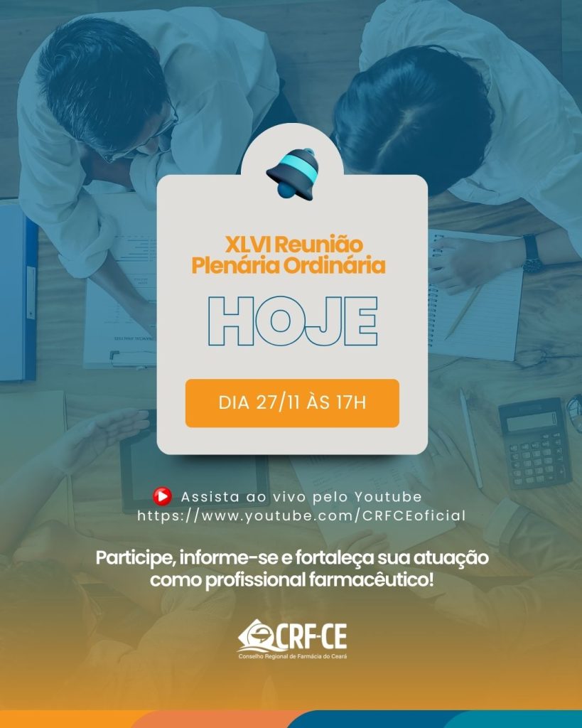Nesta quinta-feira, 27 de novembro, a partir das 17 horas, será realizada pelo Conselho Regional de Farmácia do Ceará (CRF-CE) a XLIV Reunião Plenária Ordinária, e convidamos você para assistir ao vivo pelo nosso canal oficial do Youtube.