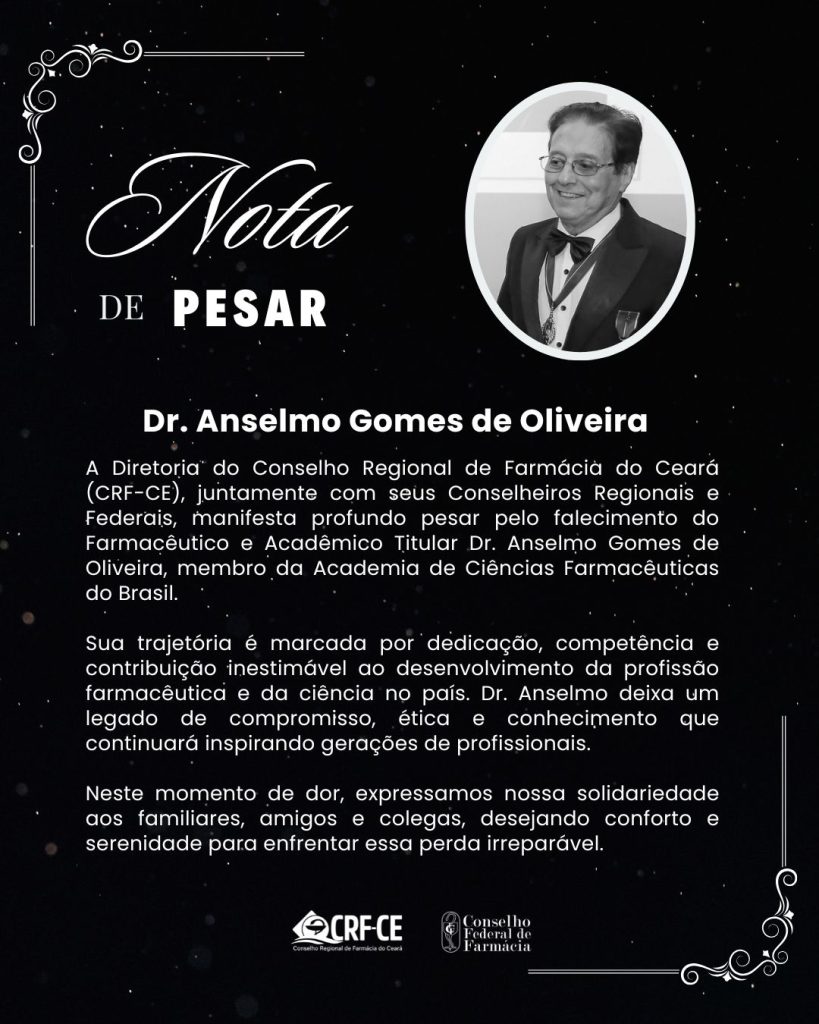 A Diretoria do Conselho Regional de Farmácia do Ceará (CRF-CE), juntamente com seus Conselheiros Regionais e Federais, manifesta profundo pesar pelo falecimento do Farmacêutico e Acadêmico Titular Dr. Anselmo Gomes de Oliveira, membro da Academia de Ciências Farmacêuticas do Brasil.