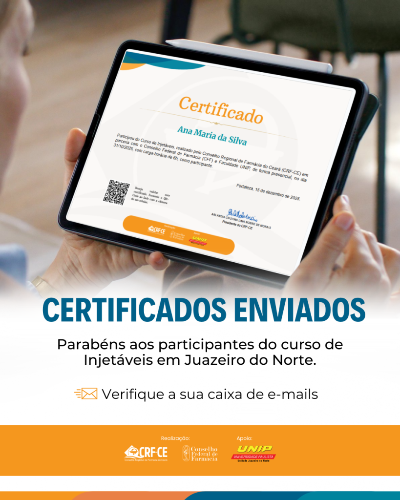 #CRFCE #CursoDeInjetáveis #CapacitaçãoFarmacêutica #CertificadosEnviados #Farmacêutico #EducaçãoContinuada #JuazeiroDoNorte