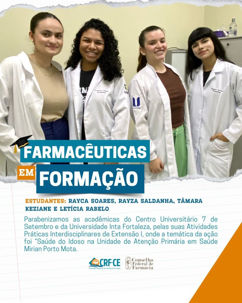 A Diretoria do Conselho Regional de Farmácia do Ceará (CRF-CE), Conselheiros Federais e Regionais, parabenizam as acadêmicas do curso de farmácia do Centro Universitário 7 de Setembro (UNI7) e da Universidade Inta Fortaleza (UNINTA) Rayca da Costa Suarez, Rayza Saldanha, Tâmara Keziane e Letícia Rabelo pelas suas Atividades Prática Interdisciplinares de Extensão I (APIEX I).