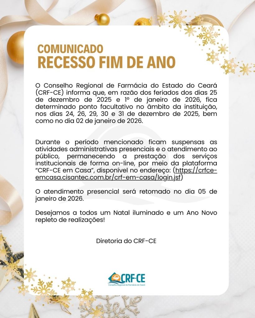 O Conselho Regional de Farmácia do Estado do Ceará (CRF-CE) informa que, em razão dos feriados dos dias 25 de dezembro de 2025 e 1º de janeiro de 2026, fica determinado ponto facultativo no âmbito da instituição, nos dias 24, 26, 29, 30 e 31 de dezembro de 2025, bem como no dia 02 de janeiro de 2026.