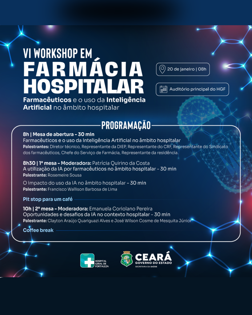 O evento abordará o tema “Farmacêuticos e o uso da Inteligência Artificial no âmbito hospitalar”, promovendo a troca de experiências, o debate técnico e a atualização profissional sobre os desafios e as oportunidades do uso da IA na prática farmacêutica hospitalar.