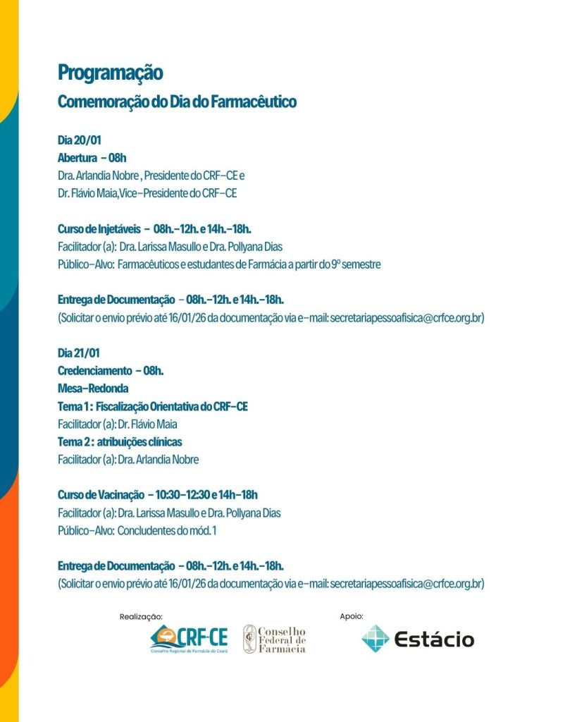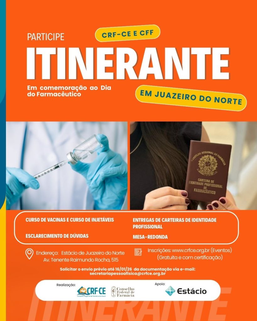 Em alusão ao Dia Nacional e Estadual do Farmacêutico, celebrado em 20 de janeiro, o Conselho Regional de Farmácia do Ceará (CRF-CE), em parceria com o Conselho Federal de Farmácia (CFF) e Apoio da Estácio de Juazeiro do Norte, promove mais uma edição do Projeto Itinerante, nos dias 20 e 21 de janeiro de 2026, em Juazeiro do Norte.