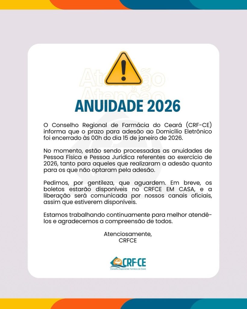 O Conselho Regional de Farmácia do Ceará (CRF-CE) informa que o prazo para adesão ao Domicílio Eletrônico foi encerrado às 00h do dia 15 de janeiro de 2026.