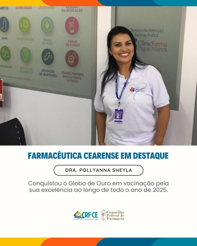 O Conselho Regional de Farmácia do Ceará (CRF-CE), por meio de sua Diretoria, Conselheiros Federais e Conselheiros Regionais, parabeniza a farmacêutica Dra. Pollyanna Sheyla por ser o destaque nacional de vacinação em todo o ano de 2025.