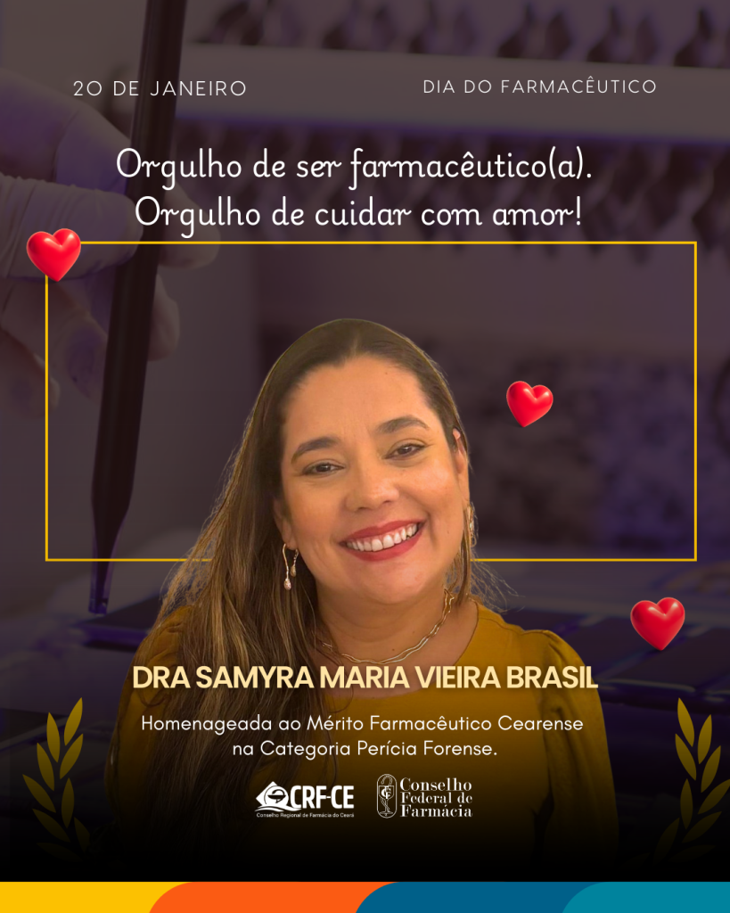 O CRF-CE homenageia a Dra. Samyra Maria Vieira Brasil, Mérito Farmacêutico Cearense – Categoria Perícia Forense, em reconhecimento à sua destacada contribuição para a ciência, a justiça e a segurança pública no Estado do Ceará.