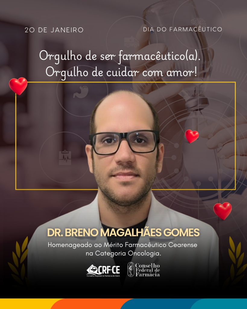 O farmacêutico Dr. Breno Magalhães Gomes é homenageado com o Mérito Farmacêutico Cearense – Categoria Oncologia, reconhecimento a uma trajetória marcada pelo compromisso, sensibilidade e excelência no cuidado ao paciente oncológico.